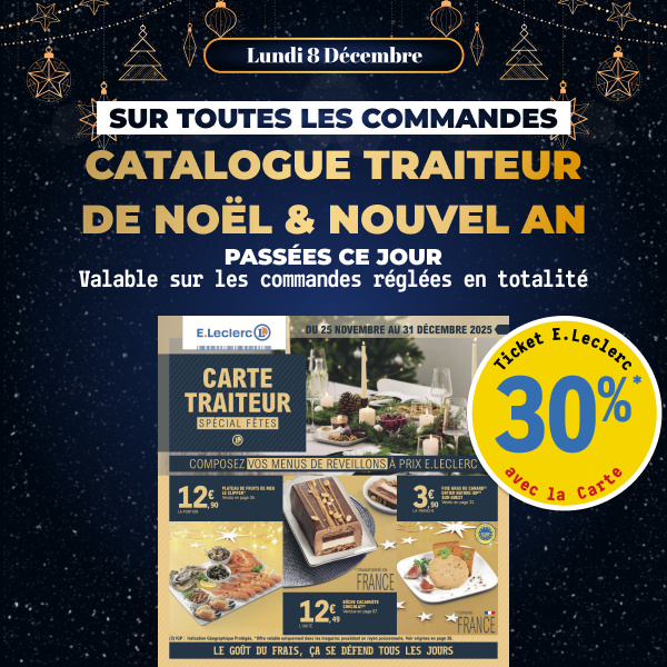 Valable sur les commandes réglées en totalité Ticket E.Leclerc crédité sur votre carte de fidélité et utilisable dès le lendemain de son obtention pour les porteurs de la carte de fidélité E.Leclerc. Offre non cumulable avec les offres en cours. Voir conditions en magasin.