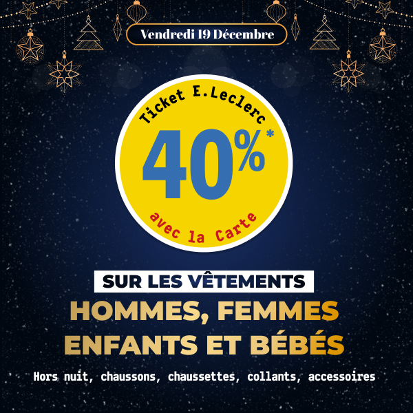 Ticket E.Leclerc crédité sur votre carte de fidélité et utilisable dès le lendemain de son obtention pour les porteurs de la carte de fidélité E.Leclerc. Offre non cumulable avec les offres en cours. Voir conditions en magasin.